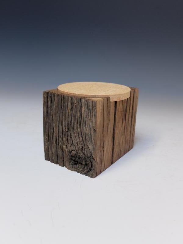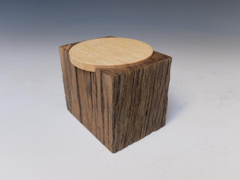 Der Dosenkörper besteht aus Eiche. Dies war einer von zwei Pfählen, die 80 Jahre eine Teppichstange trugen. Zwei Seiten der Dose zeigen das verwitterte Äußere des Pfahles. Der Braunton des Holzes entstand durch Räuchern. Diese Stange wurde überflüssig, da alle Mietparteien längst über einen Staubsauger verfügten. Für den Deckel wählte ich Koto, weil es - in der richtigen Ebene geschnitten - interessante Markstrahlen zeigt.