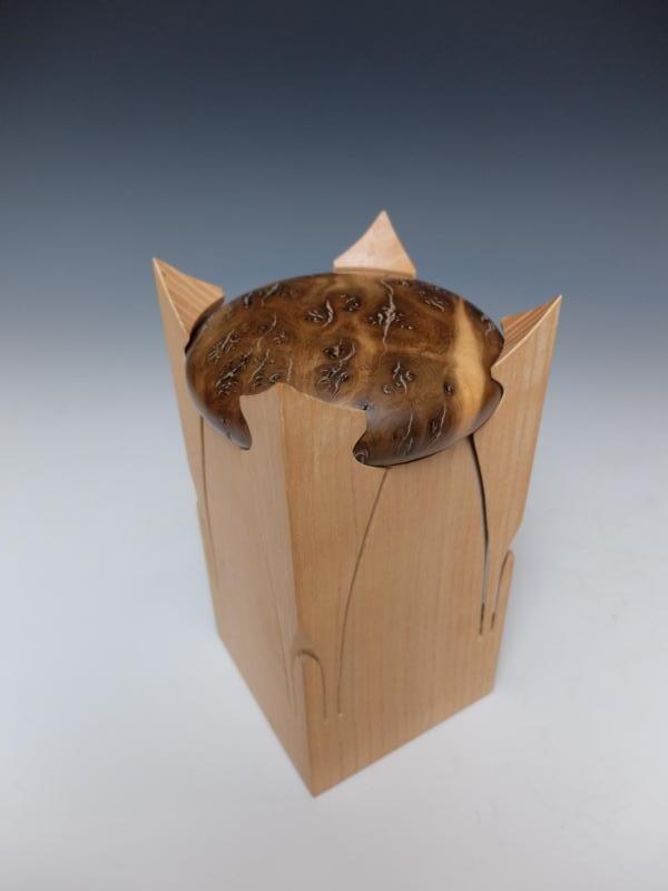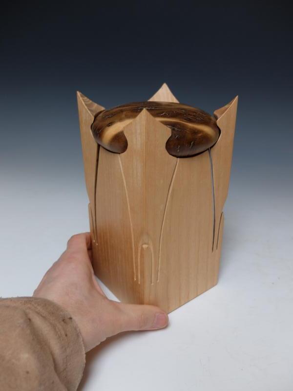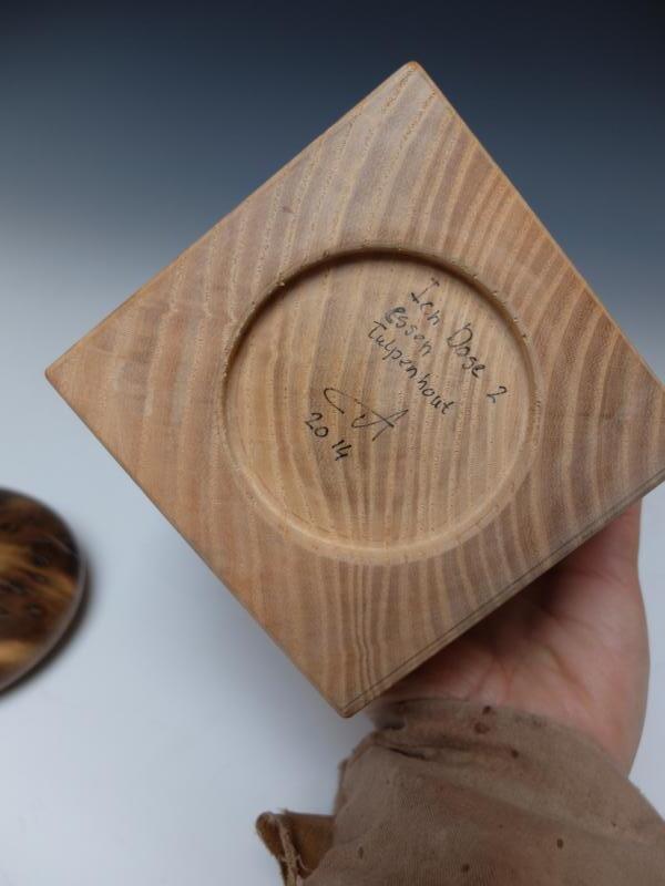 Ein Selbstporträt in Dosenform. Die Inspirationsquelle war eine Aussage meines Schwagers, der ausrief: "Hey Dose, so machst du das nicht!". Auch ein Experiment mit dem Verschluss einer Massivholzdose, Das Spiel mit den Materialeigenschaften und Einschränkungen. Dies ist die zweite, verbesserte Version eine Dose für eine Gruppenausstellung im Jahr 2013 im PEK-Gebäude in Wageningen. In der ersten Version waren die langen Beine nicht stark genug, die Zugabe der kurzen Beine sorgt für den richtigen Ausschlag / Bewegungseinschränkung der langen Beine.