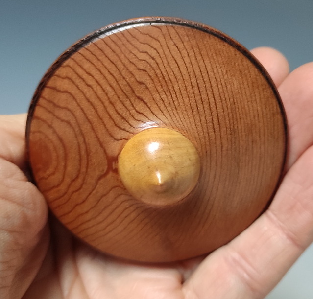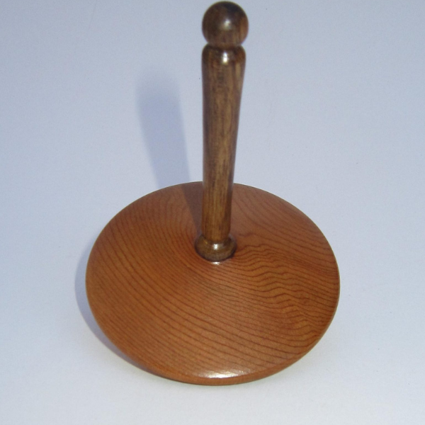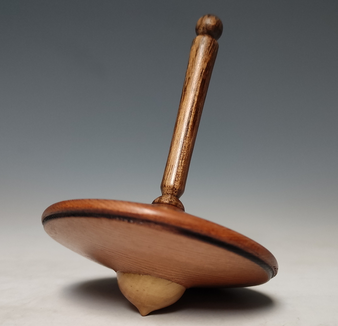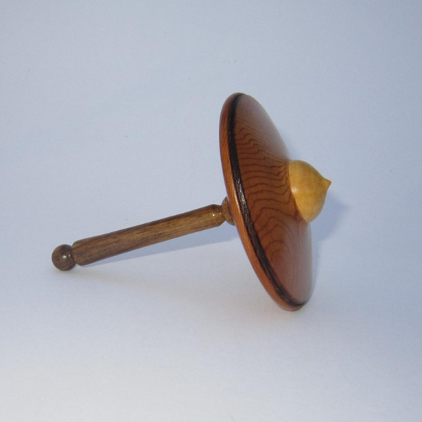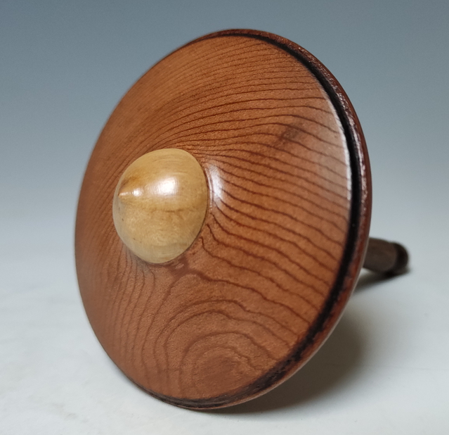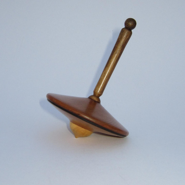 Die Achse besteht aus Walnussbaumholz und der eingepasste Kreiselkörper ist aus Redwood gedrechselt.